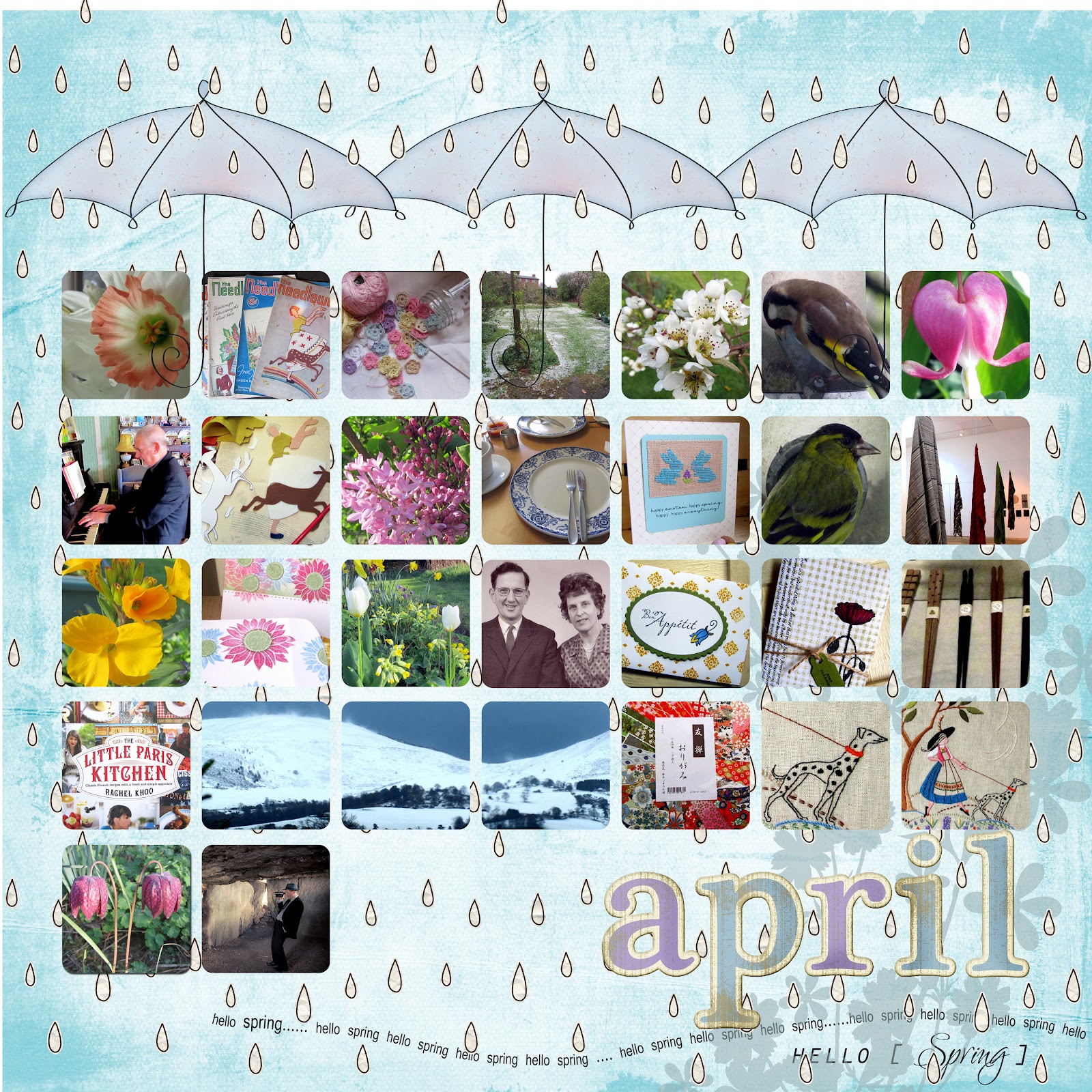 Well April showers we've certainly had this month - not to mention a few hail storms and blizzards for variety! And what with the cold miserable weather and family illness I've found it difficult to fill my April page with memories and craftiness. However I managed to complete my little squares with things I want to remember eventually and added a few digital scraps for interest. Tomorrow the lovely month of May will be here and I hope a change in the weather for us all.